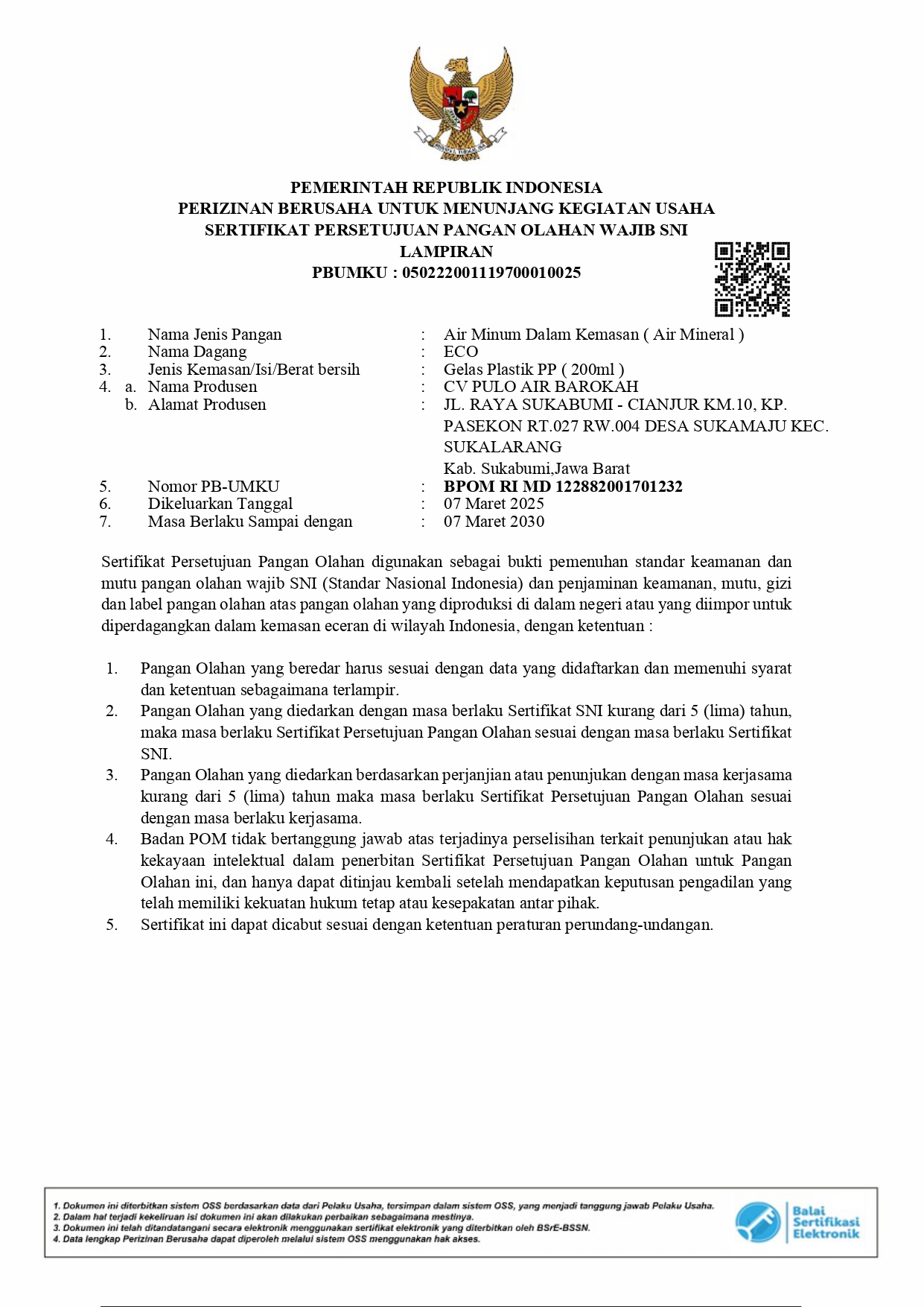 ECO+ berkomitmen menghadirkan air mineral alami yang tidak hanya segar, tetapi juga telah melewati berbagai proses pengujian dan sertifikasi resmi sesuai standar nasional.